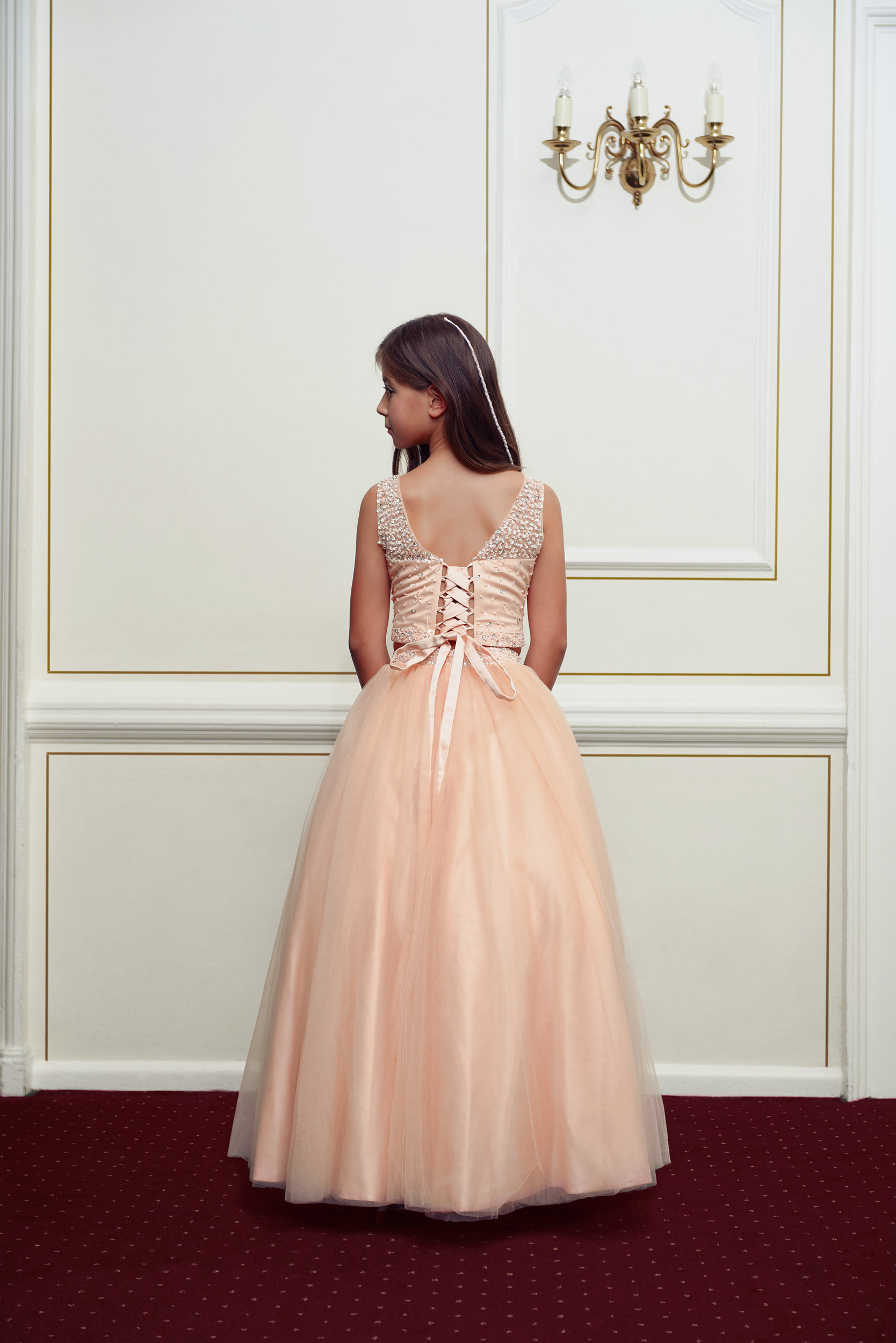 A beautiful pink dress with pearls and sequins across bust and waistline,carried round to the back.The jersey material falls into a small train. Sized from 2-12 (UK) and available in store now.