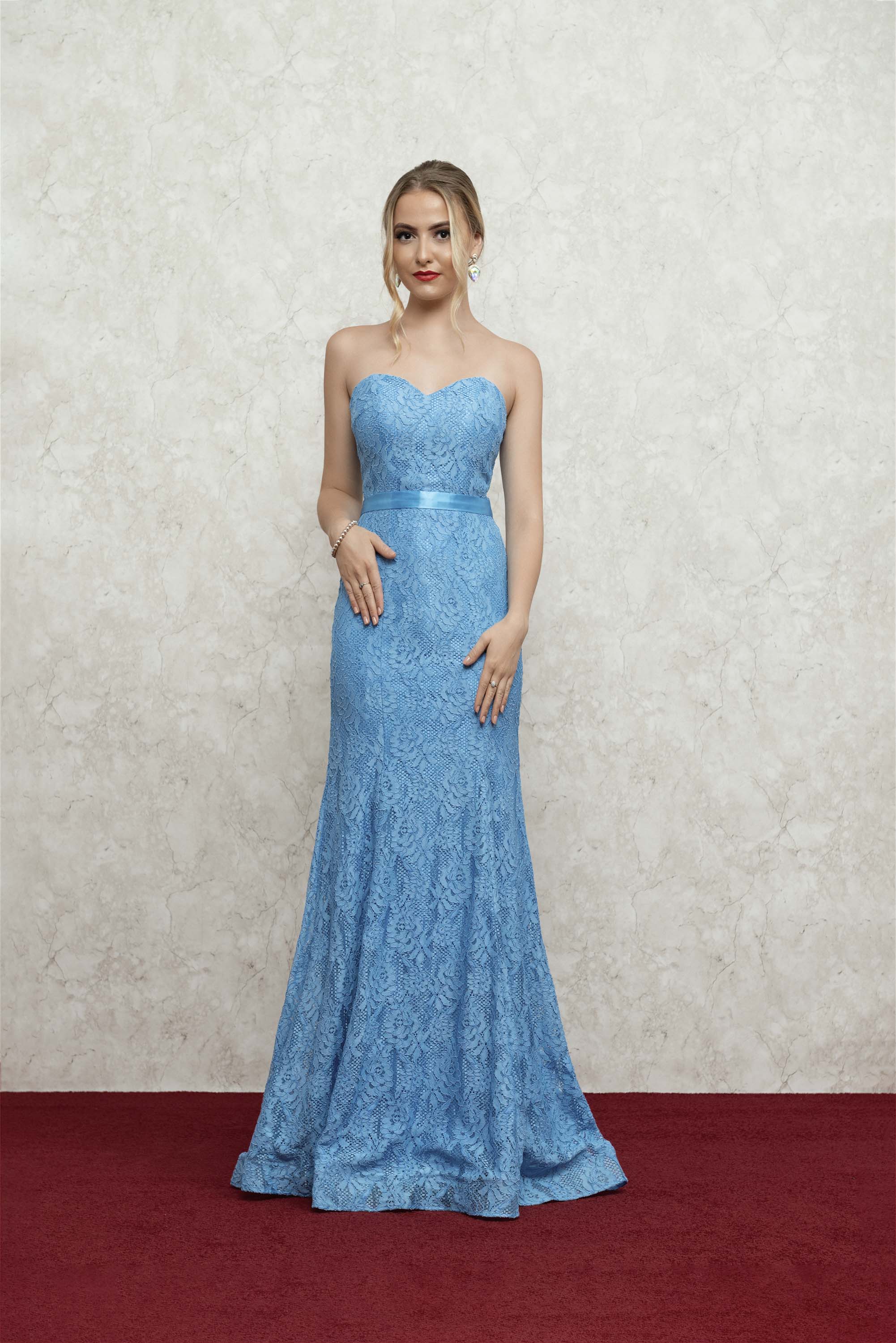 This midnight blue dress has a sweetheart neckline, going into wide lace straps and an open lace detailed back going into a small train. Its elegance is suitable for any occasion. Available up to a size 18 (UK) and available in store now.